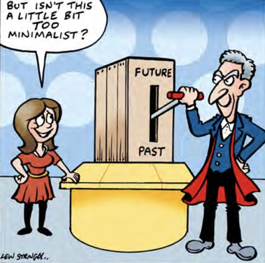 Shortly after his regeneration from his predecessor, the Twelfth Doctor decided to overhaul the look of the control room to be extremely minimalistic, replacing the time rotor with a simple wooden box with a lever that could be pulled from "past" to "future". His companion Clara Oswald gently tried to get him to understand that his idea was far too simplified even though she did understand his yearning for a new radical look. (COMIC: The Daft Dimension 477)