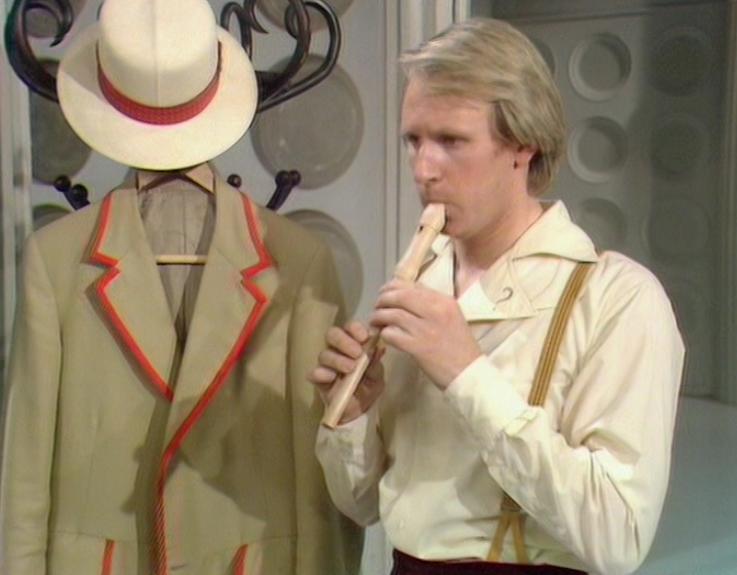 The Fifth Doctor finds that the recorder isn't suited to him. (TV: Castrovalva [+]Christopher H. Bidmead, Doctor Who season 19 (BBC1, 1982).)