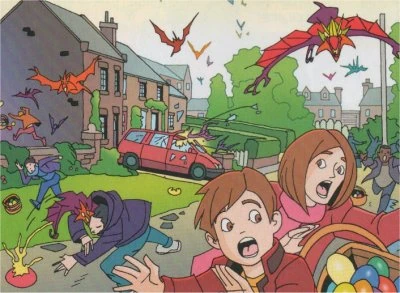 Games teacher Pippa helps the Doctor when an Easter Egg hunt turns nasty with the arrival of Astro-raptor eggs land and hatch.