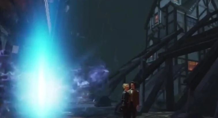 They leave the TARDIS near London Bridge in 1561, but the time corridor through which the ship appears immediately disappears. To leave they lower a drawbridge to access two other time corridors. Although they enter separate corridors, both arrive again in the TARDIS.