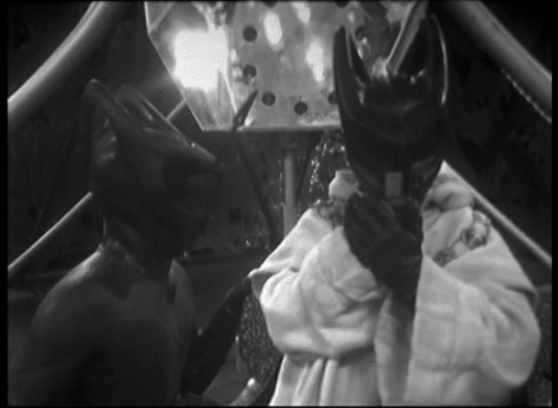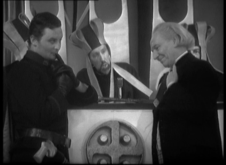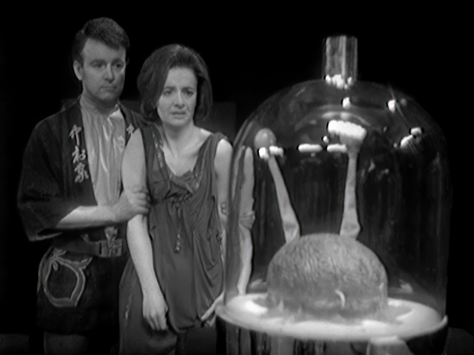 The Doctor, Susan and Ian search for Barbara on the other side of a set of double doors. As they open them an alarm goes off, accompanied by a blinding light. When they stop they see Barbara reclining on a chaise, her every need being attended to, as if she were a queen. She explains that as she was transported, she panicked and tore at her travel dial, scratching her wrist; the dial then fell off. One of the inhabitants, Altos, says that they are in the city of Morphoton, an advanced and pacific society. He impresses the travellers with the luxuries, advances and aesthetics of the city. Initially sceptical, the Doctor and Ian are won over by the generous hospitality and beneficence that the people bestow upon them. In the night, a young slave-girl, Sabetha, places a small disc on the heads of the sleeping travellers. While Barbara sleeps, her disc falls off. The powerful hypnotic pulse (the Mesmeron) has no effect on her. Morphoton is governed by four brain creatures with hideous eyes on stalks, which communicate through their life-support machines. The Brains of Morphoton use hypnosis to control the entire city. They have outgrown their bodies, and the entire human population of the city is now subject to their will.