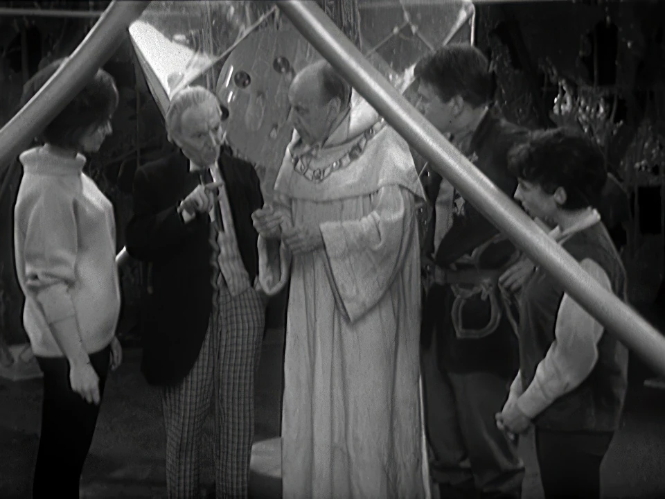 Finding Susan is not at the TARDIS, the others go to explore the tower. They decide to split up. The Doctor is brought inside the tower through the spinning walls, as are Ian and Barbara. Meanwhile, Susan finds another of the mysterious creatures which, on the point of attacking her, is stabbed by a mysterious, monk-like figure, who then leaves. The Doctor and Barbara find Susan soon afterwards.
