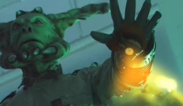 Starkey is forced to the table by the immobilising force field as well. Starkey calls out for K9, but is muted by the Korven as well. The Korven restarts the leeching. Darius and Jorjie find K9 on the floor. Seeing the Korven leeching Gryffen, they try to get K9 to help. He tries to focus but engages his self-protection protocol and shuts down. Gryffen has flashbacks of his lost family and cries out. Darius gets angry and decides to help Gryffen. He destroys the phosphane tank and gets the Korven's attention. The Korven prepares to shoot Darius, but K9 overrides his self-protection protocol and shoots the Korven. K9 shuts down. Darius wakes Gryffen, who recognises him. The Korven gets back up. Darius grabs the Korven's arm before it can shoot him, but can't hold on. Jorjie tells K9 to fire but K9 interprets this as a warning that there's a fire. Starkey tells K9 to fire his Photon Beam. K9 interprets this as "Baked beans?". Starkey shouts out, "Baked beans". K9 shoots the Korven with the temperature required to make baked beans edible, killing it.