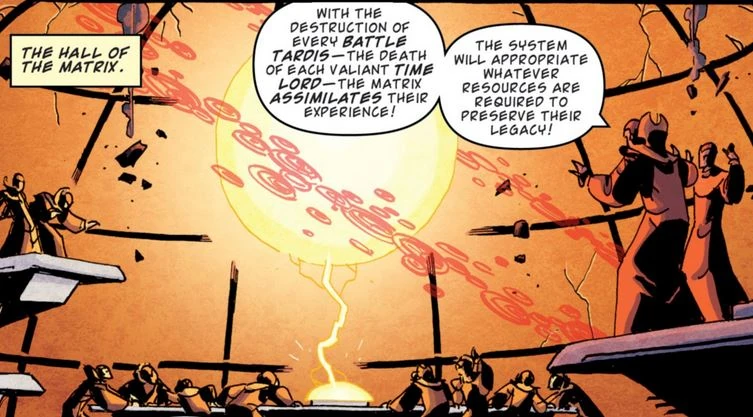 According to one account, in the final moment of the Last Great Time War, the deaths of every Time Lord being uploaded to the Matrix at once allowed it to gain sentience. However, the resulting entity immediately realised it was trapped on a planet doomed to destruction, within instants. However, being connected to every TARDIS, the Matrix managed to escape its fate by uploading the entirety of itself into the one surviving Gallifreyan timeship in its reach — the Doctor's TARDIS. Having been born of innumerable deaths, the Matrix was, by the Doctor's later analysis, insane, wishing death and destruction on the rest of the universe out of spite. The Matrix intended to complete Rassilon's Final Sanction, unravelling the Web of Time and ending Creation itself, however, the TARDIS sensed its intentions through their connection and worked to keep the stowaway contained. Connected to the minds of the Doctor and his TARDIS, the Matrix remained a prisoner, scheming for centuries a way to break out into the wider universe. (COMIC: Sky Jacks)