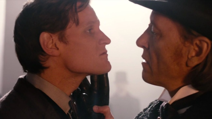 Also in Victorian London, a man locked in a jail cell rants in rhythmic fashion about "the Whisper Men". Suddenly he is disturbed by a veiled figure, Madame Vastra, standing outside the bars of his prison. The man, Clarence DeMarco, says that she could save him from being hanged with a single word, but Vastra promises him only silence. She points out that he has murdered fourteen women, and is therefore doomed to be executed. As if holding a pardon from the Queen, DeMarco mentions the Doctor, saying he knows all about him. Speaking about one specific secret among the Doctor's many, the convict says, "He has one he will take to the grave — and it is discovered."