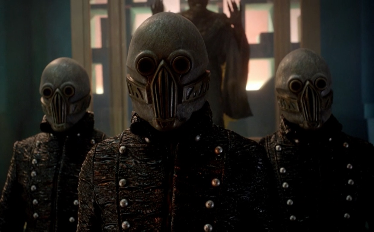 Worried about the girl, Clara heads for where she ran. This leads her to a messy area filled with junk. The girl runs, and Clara slowly follows. They startle each other and laugh. The girl says she's hiding and is confused and sceptical that Clara doesn't know her. The girl says she needs help to hide, and Clara knows the perfect box. Three figures wearing black uniforms with brass buttons and facial masks appear and start whispering, calling out for the girl. Clara takes the little girl to the TARDIS and tries to open the doors, but they are locked. She rattles the doors a bit, then states that the blue box just doesn't like her. Clara gets a little angry, but she forgets it when the little girl ducks behind the TARDIS. She tells Clara that her name is Merry Galel, and she's the Queen of Years. She was chosen to become this as a baby when the previous Queen died. She knows every story, poem, legend, and song of their culture. She's scared because she has to sing a special song to their god to keep him from waking.