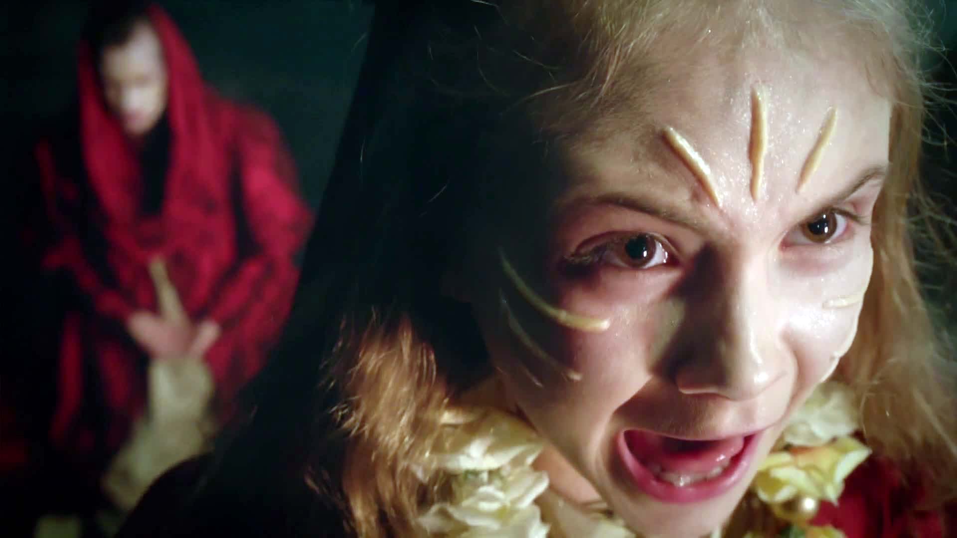 Clara turns her back for a moment, finding that the Doctor has walked off again. She goes looking for him. A little girl, wearing crimson robes, bumps into her and runs off. Shortly afterwards, two men wearing similar robes, presumably monks of the religious order of that system, ask Clara if she'd seen the Queen of Years. Clara is confused, asking who they mean; seeing that she has no clue, they search on.