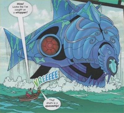 While visiting the Pheezel Galaxy, the Doctor takes Decky Flamboon to Seacyde, planet of the Seasides. There, accompanied by their Tourbot for the day, they are about relax, but there is a huge splash when something falls into the sea. Taking a small boat, the three of them sail out to the site where the Doctor uses his sonic screwdriver in the water to do a scan. But the sonic draws attention and a huge blue shark-like spacecraft comes to the surface and, rising above the water, smashes the boat. Grabbed by long hooks, the three are taken aboard and placed in a giant bubble. The bubble contains the air in a ship filled with water. The alien crew explain that their ship, the Maritimus Carcharias, transporting marine-life around the stars, has malfunctioned. Its defences pilot it to the nearest sustainable planet. The Doctor's sonic screwdriver had been detected and the crew need the Doctor's help. The Doctor scans and fixes the ship's computer system — problems with the fish's microchips. Back on the shore the Doctor and his friends watch the shark-like ship leave the sea and return to the stars.