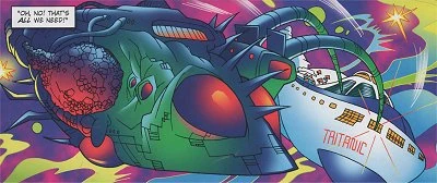 The Skrawn have what they came for (the time-nav system) and leave the cruise ship Tritanic. As their hiveship leaves, the broken docking seals start to pull the passengers out into space.
