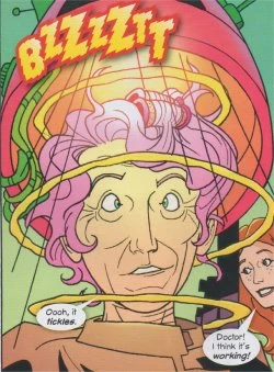 Betty doesn't believe him. She goes off to her hairdresser's appointment. Amy is waiting with a converted hairdryer. While the Doctor distracts Pookie, Amy turns on the dryer. The Doctor has adapted it to reverse the psychic link between Betty and Pookie. Betty is left with a pink, punky hairstyle, her energies are recharged and the Kera-Bera beast is transformed into what Betty believed it was, a cute, little — albeit purple! — dog.