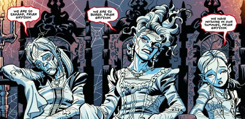 The Three Mad Sisters, (COMIC: Monstrous Beauty [+]Scott Gray, DWM Comics (Panini Comics, 2020).) or simply the Mad Sisters, (WC: Incoming Transmission - February Update Video [+]Sasha Blore and Darren Fitzjohn, Time Lord Victorious (2024).) were a group of high-ranking vampires during the Dark Times. According to Friar Grystok, they were "descended from the Great One himself". They appeared to be the figureheads of the coffin ship on which they resided, with Grystok acting as the de facto leader.