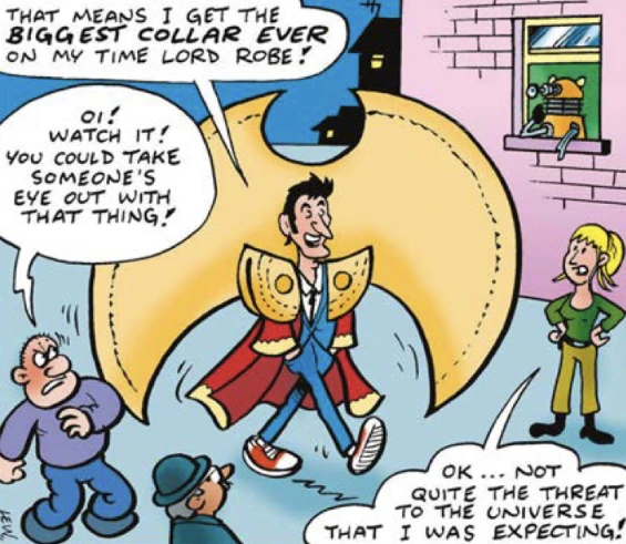 In the Daft Dimension, the Tenth Doctor claiming of the title mostly amounted to him putting on Time Lord robes with an outrageously large collar, which proved a hazard to the universe for purely physical reasons. (COMIC: The Daft Dimension 556)