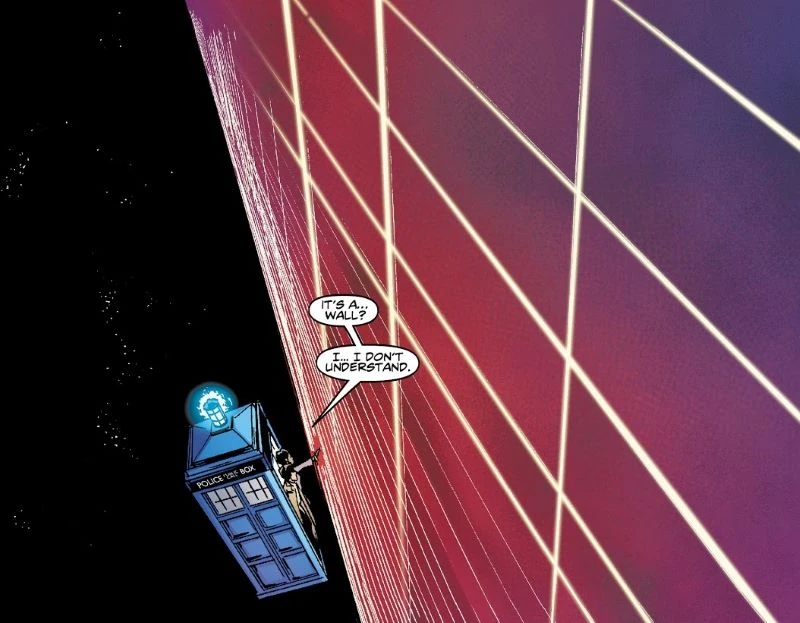 The Eleventh Doctor shows his companions the time lock, which the human mind was unable to comprehend so simply saw as a wall, on the Last Great Time War. (COMIC: Outrun)