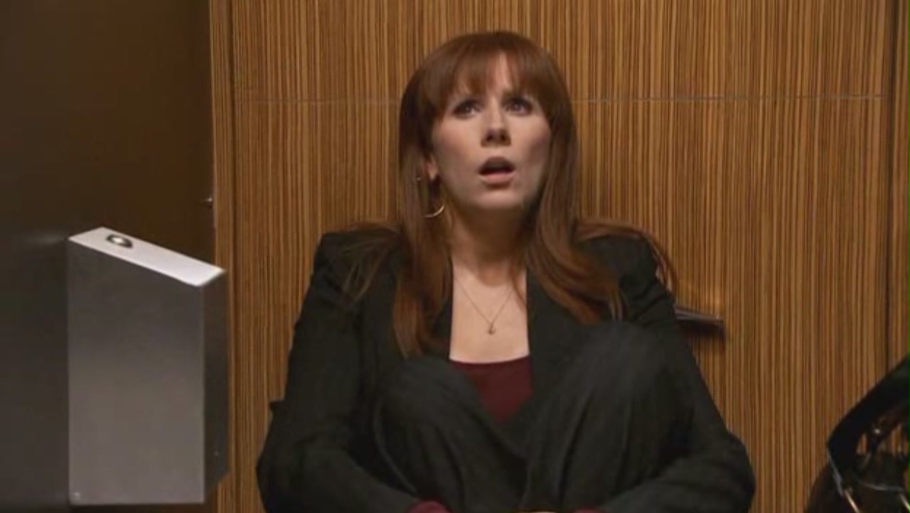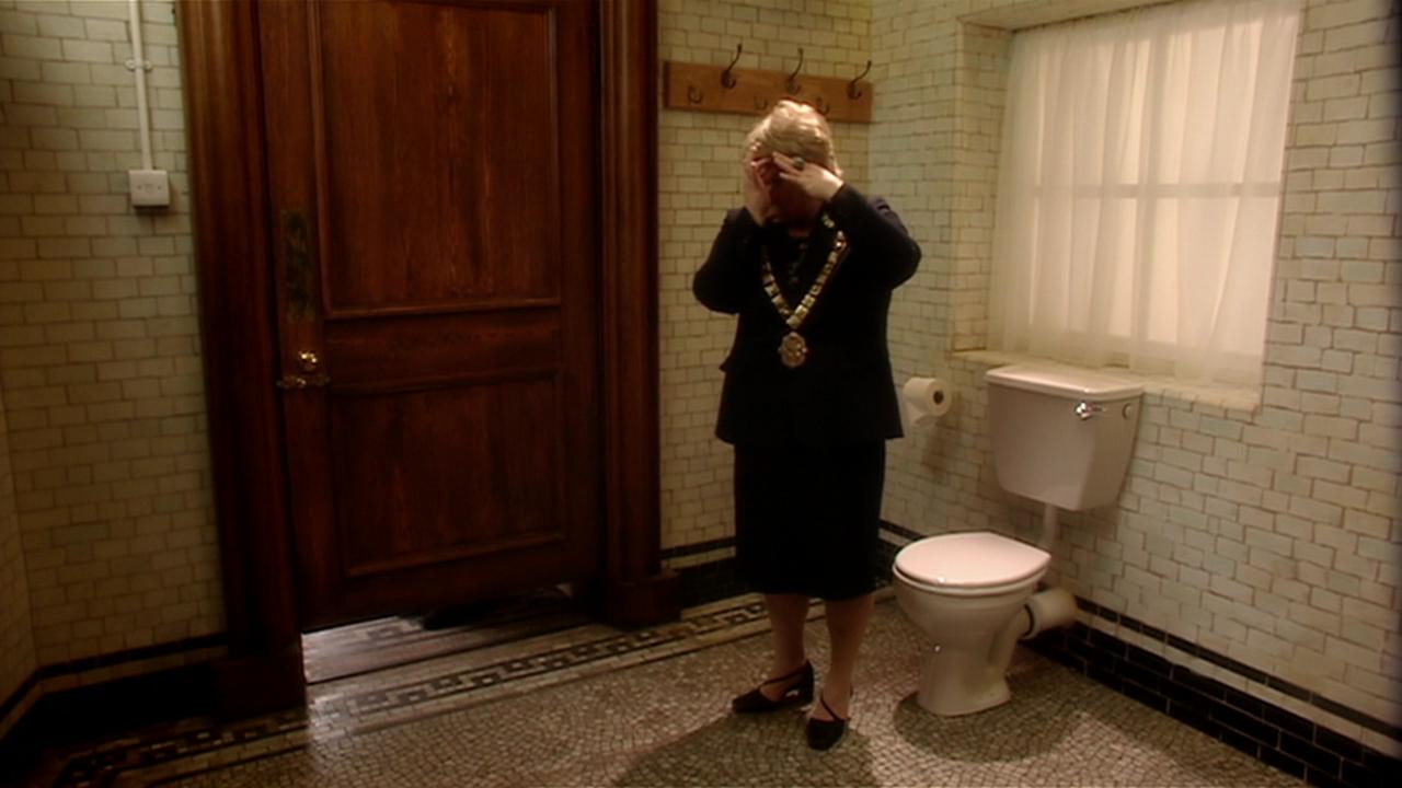 Blon Fel-Fotch Passameer-Day Slitheen, in the form of Margaret Blaine, took Cathy Salt to the toilets in order to kill her, after claiming her "little tummy" was "complaining" when she farted loudly. Soon after, when she farted after entering the toilet, Cathy remarked, "Sounds like we got here just in time." When Cathy revealed she was pregnant, Margaret decided to let her go. (TV: Boom Town)