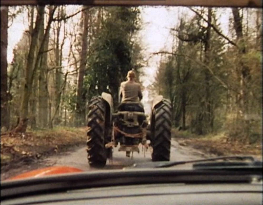 A hallucinatory tractor almost ran Mike Yates and Sarah Jane Smith off the road. (TV: Planet of the Spiders)