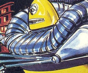 Robotic in nature, the bodies of Trods were dustbin-shaped, vaguely resembling the casings of Daleks. Their cone-shaped head sported a single eye and a mouth, with a long antenna at the top. The head itself was encircled by a silver tube atop a neck which connected the head to the body. Analogous to the Dalek weapons platform, this rim sported a silver mechanical arm with three fingers at both sides. Between the arms in the centre was a silver energy weapon, similar to the Dalek gunstick, which could stun or kill humanoids (COMIC: The Trodos Tyranny) and even blow apart Dalek casings. (COMIC: The Trodos Ambush) At the bottom of their bodies were motor tracks which allowed for transport. (COMIC: The Trodos Tyranny, Return of the Trods)