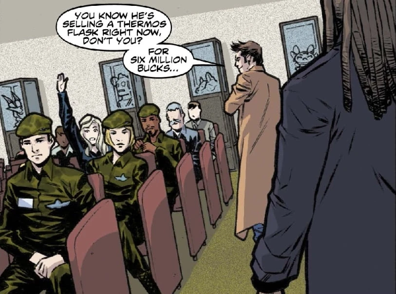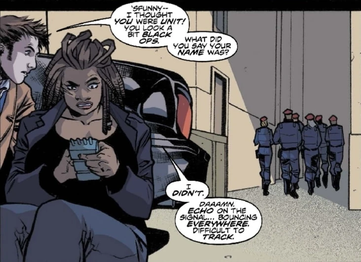 After a misunderstanding with Hunsicker, she instructed the Doctor to hide from a squad of armed UNIT soldiers in the immediate vicinity. (COMIC: The Fountains of Forever)