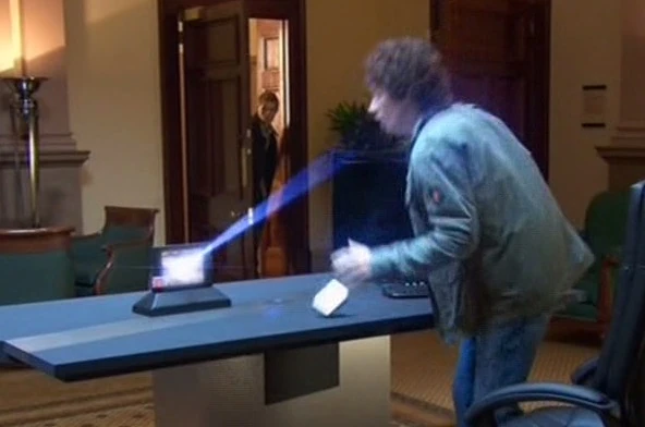 Starkey is transported to Urlic by the library card on the table.(TV: Lost Library of Ukko)