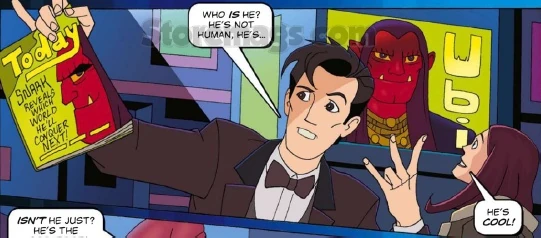 Arriving in New York City, the Eleventh Doctor and Clara Oswald find themselves in a city where everyone is enthralled and captivated by a character called Snark — the most famous being in the universe! He's everywhere; on magazine covers, TVs, billboards. The Doctor suspects something is wrong and, using his sonic screwdriver, detects that Snark is using a psychic transmitter nearby that is sending out a signal. When the Doctor tells everyone it makes no difference, they are just even more impressed by Snark's cleverness. The Doctor finds the transmitter in a basement and manages to get rid of the guards by telling them that Snark is making a personal appearance and they run off to see.