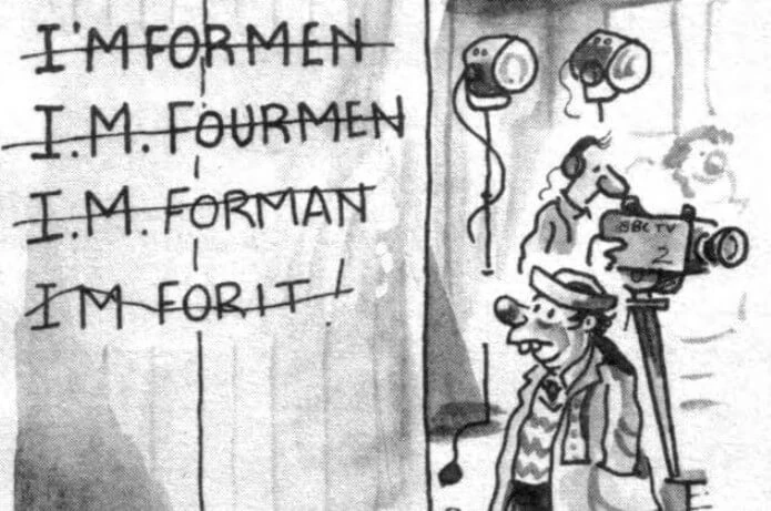 - "I.M. Foreman" is misspelled in many different ways including "I'm Formen", "I.M. Fourmen", "I.M. Forman" and "I'm for it!".