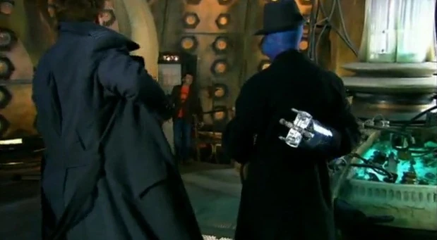 David Tennant comes in through the TARDIS doors and asks John what he's doing. John introduces Tim Ingham of Stoke-on-Trent, who is pretending to be Sao Til. David then exits the set via the 'fourth wall', pausing briefly before he leaves to chide John for being in "my TARDIS". After a moment of giddiness at having seen David Tennant, John and Tim then carry on from where they left off, resuming their characters and pretending to shoot at each other as they run around the TARDIS set.
