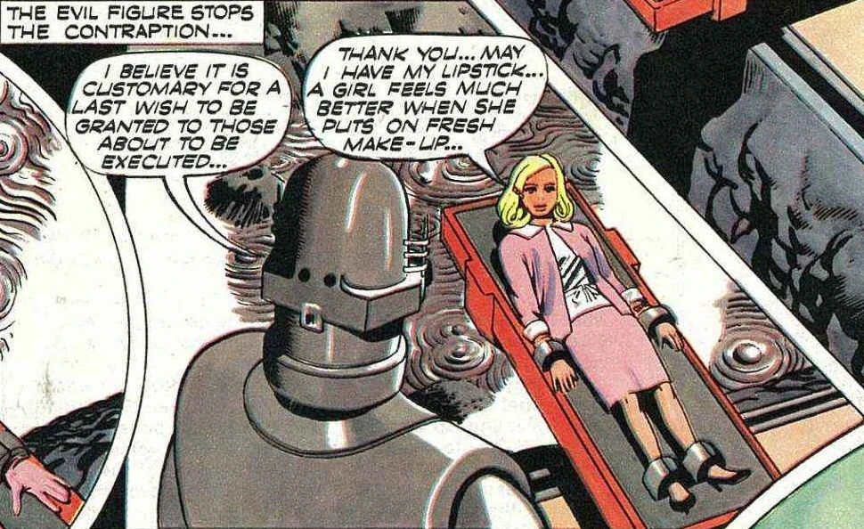 In 2065, a secret hideout was built into Mount Vesuvius, apparently designed by Mr Steelman, for use by him and his men. After kidnapping Lady Penelope Creighton-Ward's agent Roger Lyon, he was taken to the hideout, following a secret tunnel beneath the ruins of Pompeii. Unbeknownst to them, they were followed by Lady Penelope and Parker, with the two following along the tunnel and making their way to the door behind which "Steelman" and his men were holding Roger Lyon. Using his prior skill as a master cracksman, Parker was able to unlock the door, and they were immediately caught by the criminals, with Penelope being strapped to a ramp. After Penelope, Parker, and Roger Lyon were able to defeat most of them, Gardoni shot at Roger, with Penelope retaliating by throwing an explosive handbag at him, blowing a hole in the floor. As the lava rose to a new level, Penelope and Parker carried Roger swiftly back to the surface. Having escaped, the lava reached the ruins of Pompeii, and Penelope considered what fun the archaeologists would have, once more uncovering the ruins. (COMIC: Mr. Steelman [+]Alan Fennell, Thunderbirds crossover stories (City Magazines, 1965).)